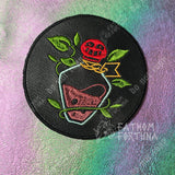 This patch inspired by the Helluva Boss pirate merch drop is available with several variations and bases! Will have iron-on backing, but I do always recommend stitching your patch to your item for security. Please see note on bases if choosing vinyl.