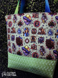 This super cute tote bag measures approximately 14" wide by 12" tall, with a 4" boxed bottom and ~23" handles. The vinyl base helps give some sturdiness, and the fully interfaced top half is reinforced with fleece, giving enough structure to stand up on it's own, even while empty! The inside is lined with water resistant canvas.