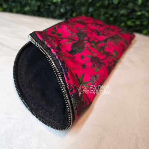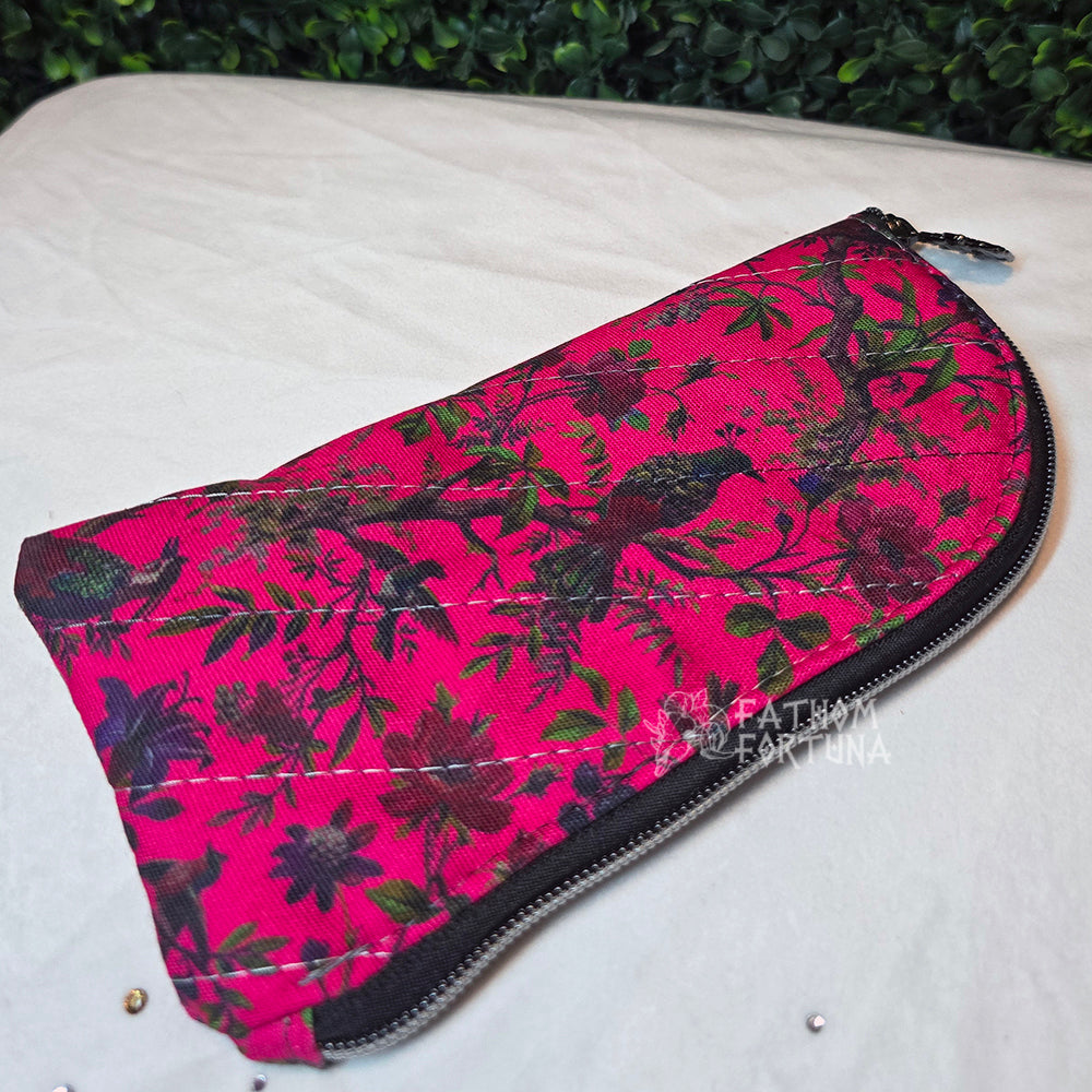 These cute curved zip cases have a quilted exterior - canvas is quilted to cotton batting, and the inside is lined with a soft flannel. About 3.75" deep by 8" tall (on the tall side, ~7.5" tall on the short side) and zips bottom to top! Is the perfect size for a pair of sunglasses, to stash some tampons, or even an epi-pen!