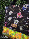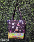 This super cute tote bag measures approximately 14" wide by 12" tall, with a 4" boxed bottom and ~23" handles. The vinyl base helps give some sturdiness, and the fully interfaced top half is reinforced with fleece, giving enough structure to stand up on it's own, even while empty! The inside is lined with water resistant canvas.