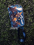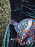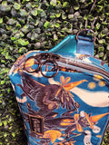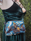 Finished bag is roughly 10 inches wide by 6 inches tall by 2 inches deep. It has a zipped slip pocket on the back. This lovingly constructed bag is bound on the inside and lined with water resistant canvas. There is a D-Ring next to the buckle that you can clip your keys or hand sani to! The strap is adjustable, making the total length (including bag width) adjust between approx 40" - 64"! If needed I can make the strap shorter before shipping, just let me know in the notes at checkout.
