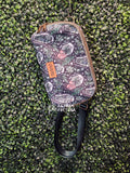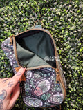 Finished bag is roughly 10 inches wide by 6 inches tall by 2 inches deep. It has a zipped slip pocket on the back. This lovingly constructed bag is bound on the inside and lined with water resistant canvas. There is a D-Ring next to the buckle that you can clip your keys or hand sani to! The strap is adjustable, making the total length (including bag width) adjust between approx 40" - 64"! If needed I can make the strap shorter before shipping, just let me know in the notes at checkout.