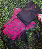 This is one of my very favorite bag styles EVER! This awesome bag is typically worn with one strap around the waist/hips and another on the thigh, but can also be worn as a crossbody bag! It has a padded back so it's super comfy against the body. There's a small zipper pocket in the flap, a 2 inch deep zippered 3d pocket under the flap, and a large pocket inside the main body. The bag body measurements are approx 11" wide at the top, 7.5" wide across the middle, and about 11" down the center  from top to bottom.