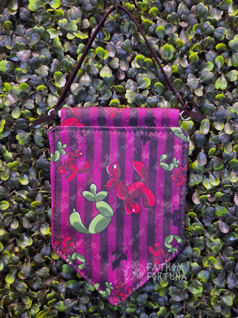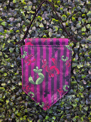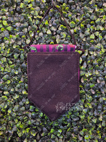 This gorgeous little pin banner has a printed canvas front and a thick felt back to give your pin collection the support it needs! Supporting the banner across the top is a 1/4" dowel with eye hooks in both ends, which help it hang from a faux-suede cord.