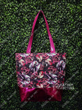 This super cute tote bag measures approximately 14" wide by 12" tall, with a 4" boxed bottom and ~23" handles. The vinyl base helps give some sturdiness, and the fully interfaced top half is reinforced with fleece, giving enough structure to stand up on it's own, even while empty! The inside is lined with water resistant canvas.