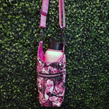 The Stunt Waterbottle pictured (not included) holds 40oz and there's lots of extra space around it! The front features a deep slip pocket that'll easily hold most phones (roughly 7 inches deep by 5 inches wide) and a smaller zip pocket to toss in some cash/cards/ID for on the go (roughly 4.5 inches deep by 5 inches wide.) The boxed bottom gives great structure and the adjustable crossbody strap (~30-53 inches) helps keep it comfy to grab and wear on the go!