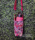 The Stunt Waterbottle pictured (not included) holds 40oz and there's lots of extra space around it! The front features a deep slip pocket that'll easily hold most phones (roughly 7 inches deep by 5 inches wide) and a smaller zip pocket to toss in some cash/cards/ID for on the go (roughly 4.5 inches deep by 5 inches wide.) The boxed bottom gives great structure and the adjustable crossbody strap (~30-53 inches) helps keep it comfy to grab and wear on the go!