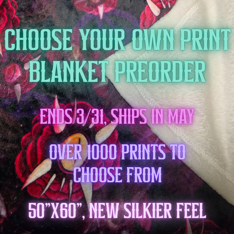 I'm offering one size of blanket this round, 50 " x 60"! Even softer and silkier than the last round, these blankets fuzzy silk touch poly flannel, 300GSM, fluffy on both sides. Print is only on the front - the back is white. Digital printing doesn't play well with printing on both sides. The edges are finished nicely. Machine washable without getting weird and crunchy (I've got a lot of sensory issues, so I know how bad a crunchy blanket feels!) Not super thin but definitely more of a throw weight.