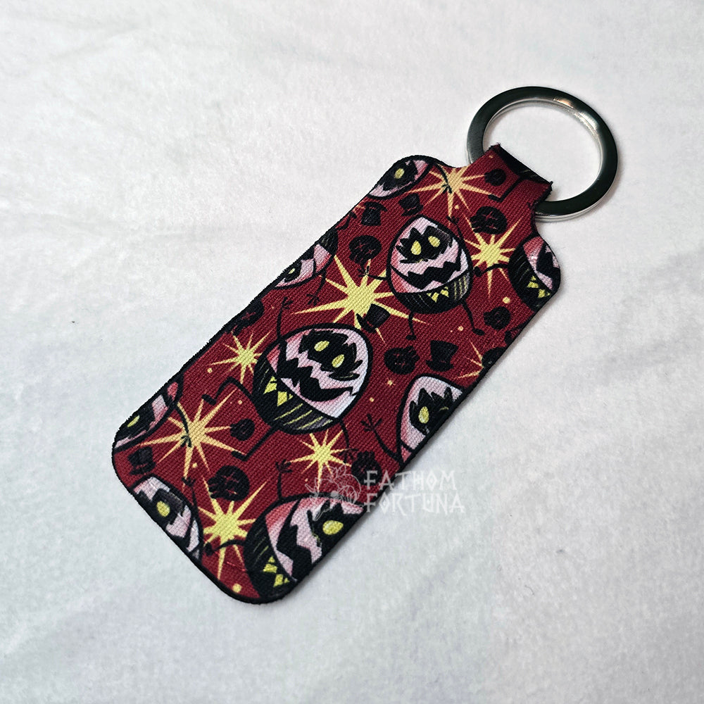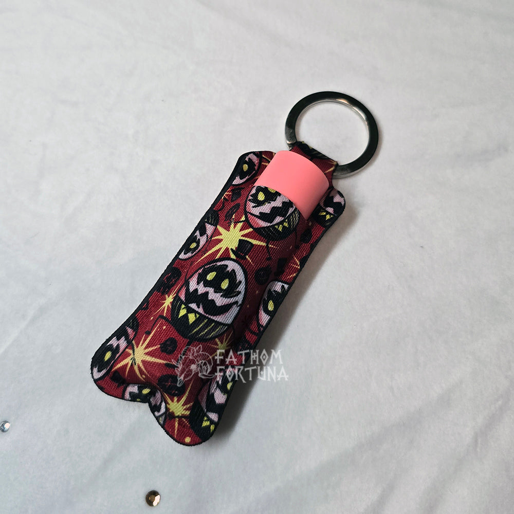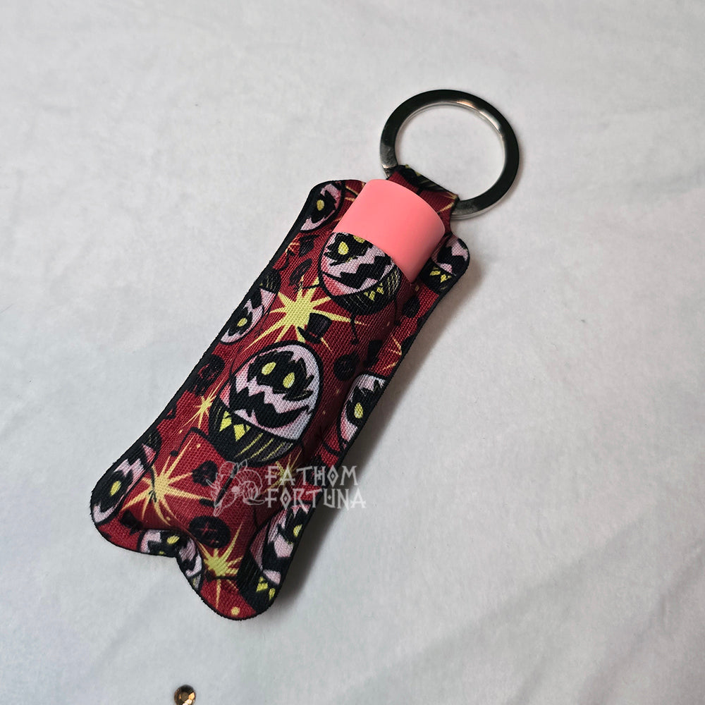 This handy-dandy lip-balm carrier keychain helps make sure you've got a 'stick on you at all times! Printed portion approx 3.75" tall x 1.5" wide and made of sublimation printed neoprene, so it's got stretch to fit most standard sized 'sticks!