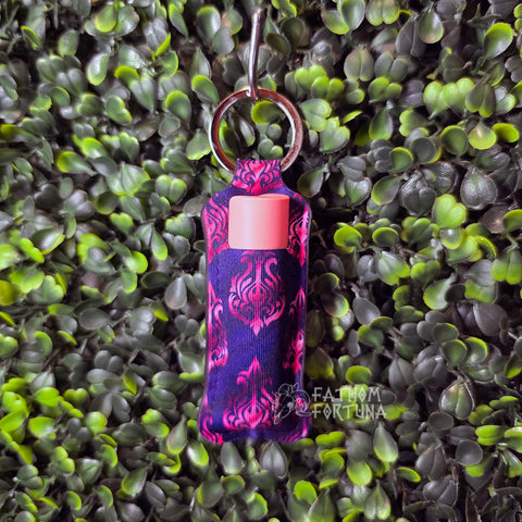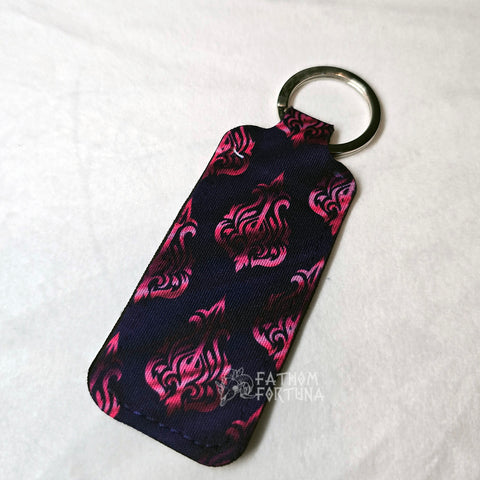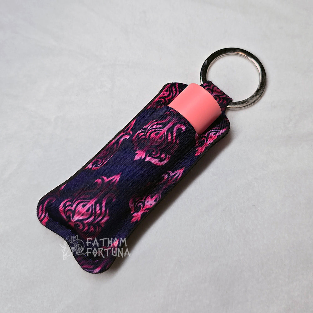 This handy-dandy lip-balm carrier keychain helps make sure you've got a 'stick on you at all times! Printed portion approx 3.75" tall x 1.5" wide and made of sublimation printed neoprene, so it's got stretch to fit most standard sized 'sticks!