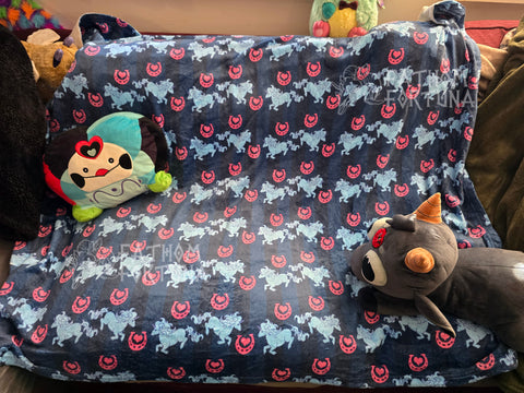 DETAILS: There are two sizes available. It's a soft fuzzy poly flannel, 300GSM, fluffy on both sides. Print is only on the front - the back is white. Digital printing  doesn't play well with printing on both sides. The edges are finished nicely. Machine washable without getting weird and crunchy (I've got a lot of sensory issues, so I know how bad a crunchy blanket feels!) Not super thin but definitely more of a throw weight.