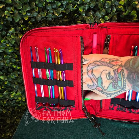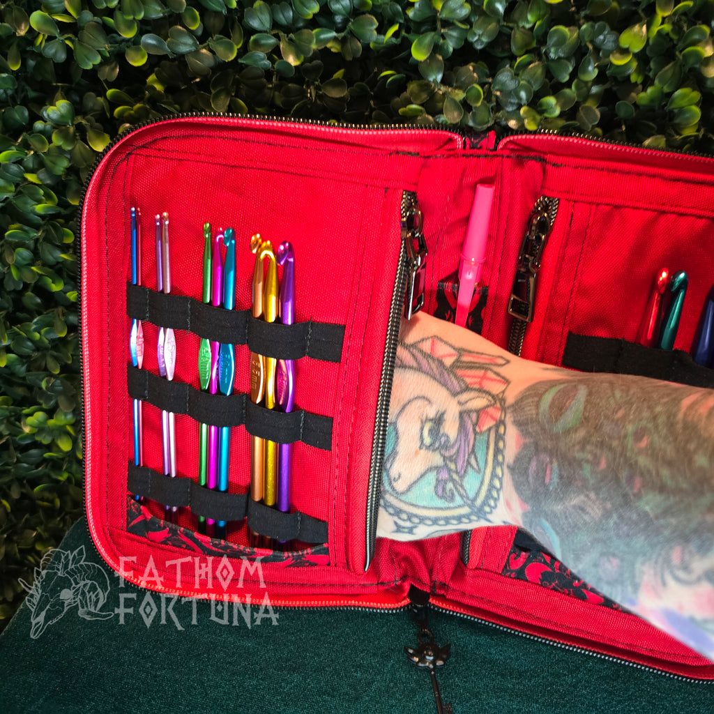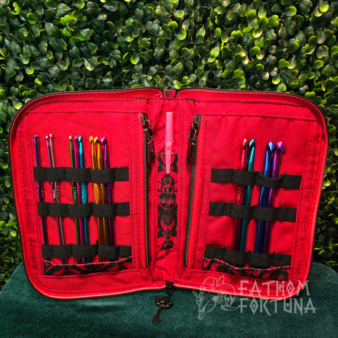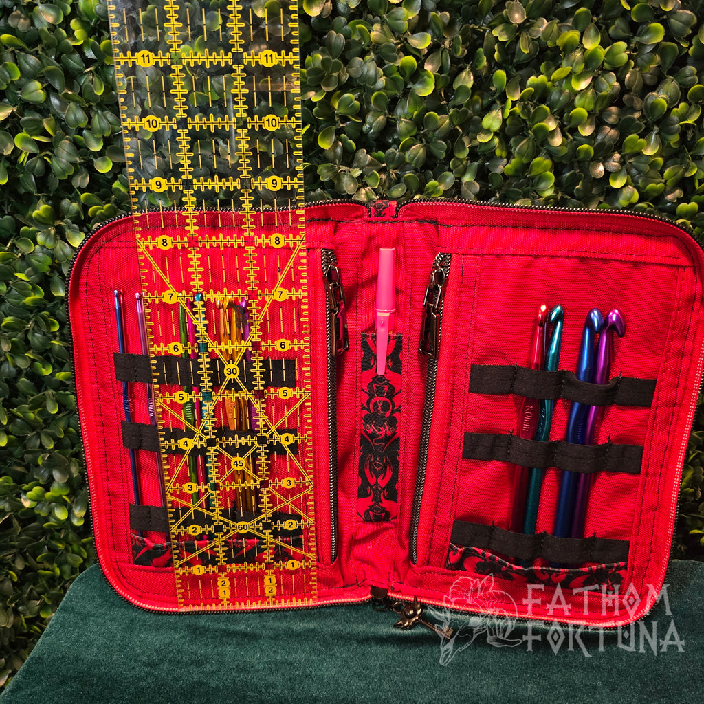 Zipped closed, the case itself is approx 8" tall x 6" wide x 1" deep. Inside the case are two zip pockets, two slip pockets, a pen slot, and multiple elastic loops to put a variety of knitting needles or crochet hooks (or other accessories!) Along the bottom is a small pocket to keep your tools of choice from slipping down out of the loops. There's a 1/2 inch D ring at the top to clip to the inside of a project bag or hang charms from. Zips fully open to be able to lay flat.