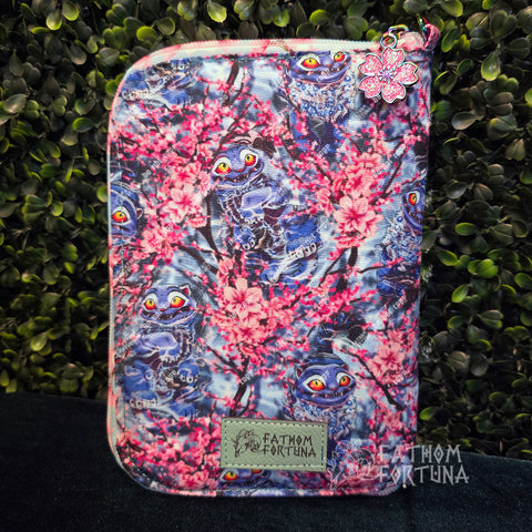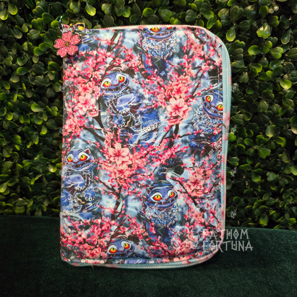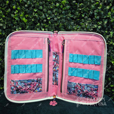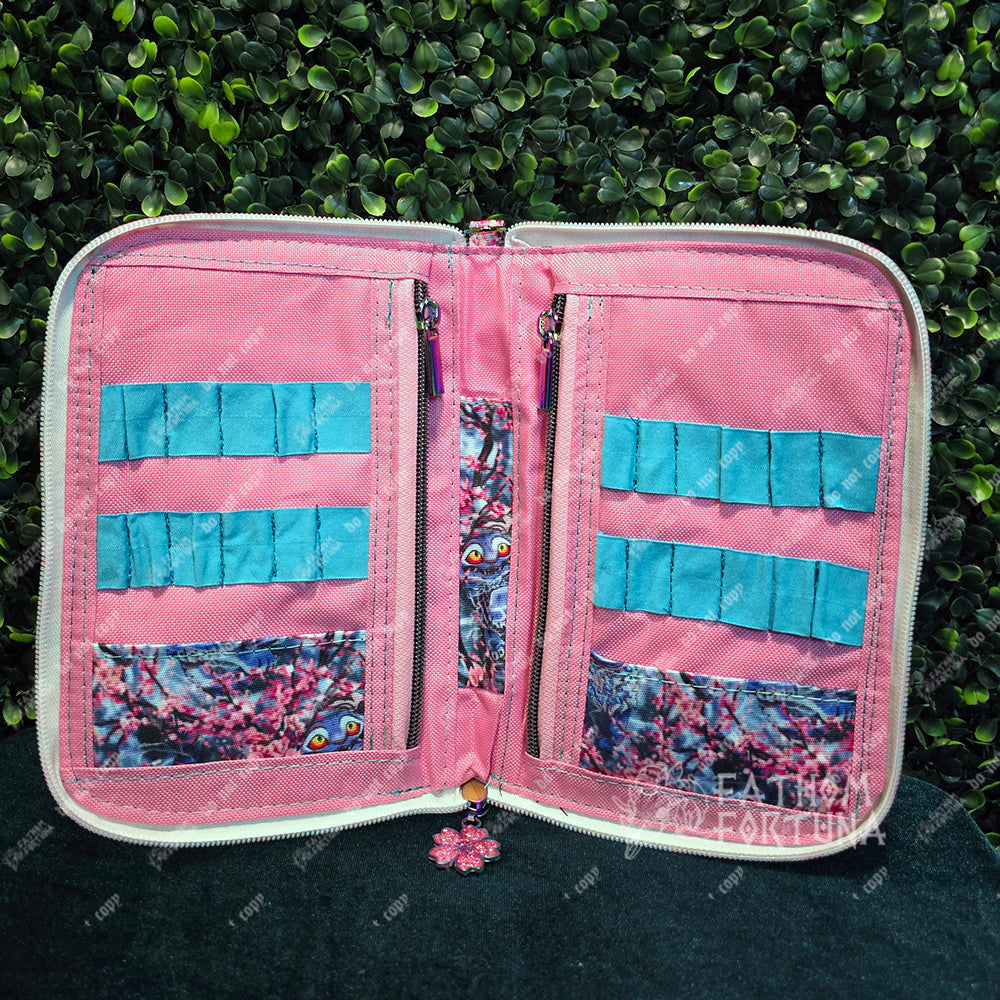 Zipped closed, the case itself is approx 8" tall x 6" wide x 1" deep. Inside the case are two zip pockets, two slip pockets, a pen slot, and multiple elastic loops to put a variety of knitting needles or crochet hooks (or other accessories!) Along the bottom is a small pocket to keep your tools of choice from slipping down out of the loops. There's a 1/2 inch D ring at the top to clip to the inside of a project bag or hang charms from. Zips fully open to be able to lay flat.
