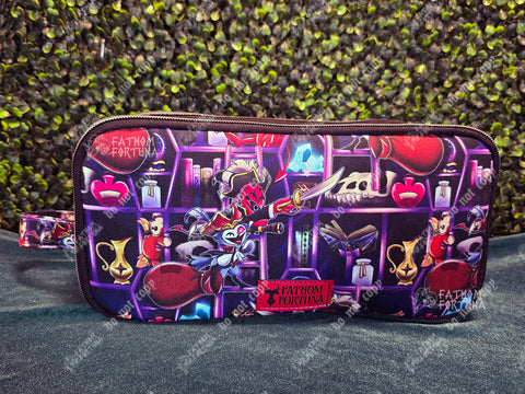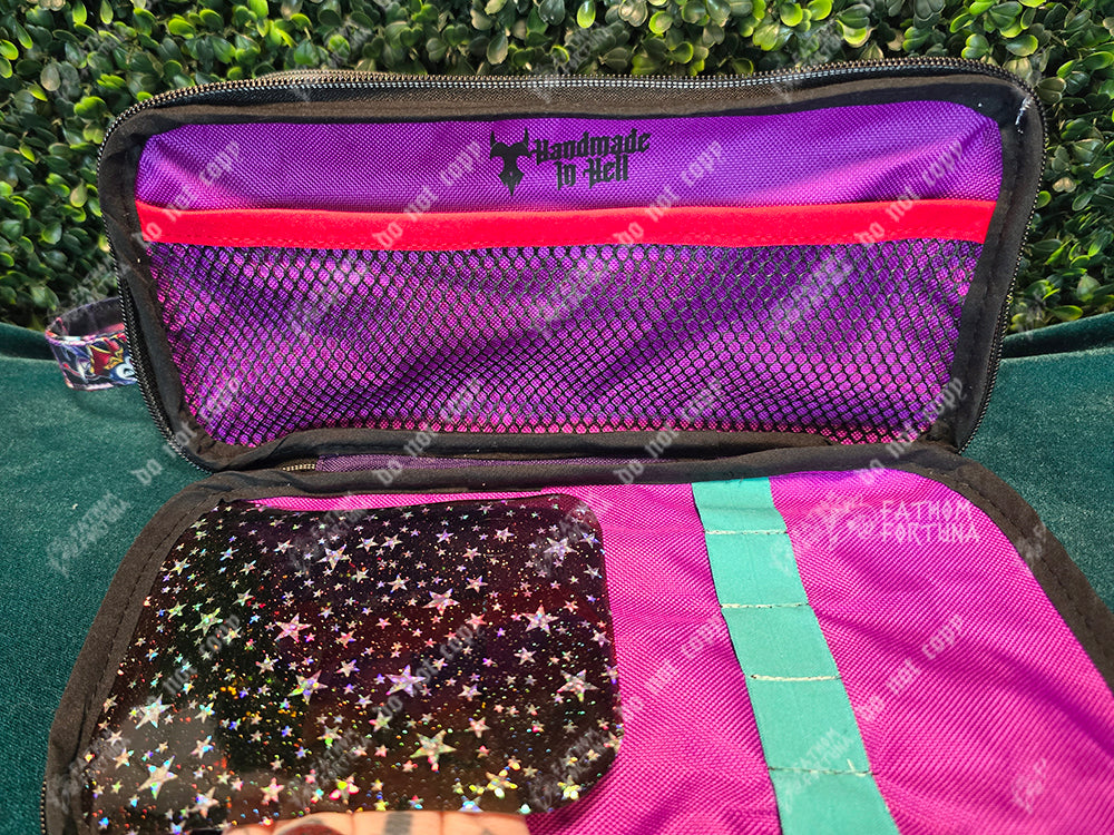 On one side you'll find two stretchy mesh pouches and an elastic strap to help hold your bits and bobs in. The other side you'll find another stretchy mesh pouch as well as segmented elastic to hold something like makeup brushes, with a smooth vinyl base and flap to help keep the bristles protected!