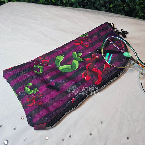 These cute curved zip cases have a quilted exterior - canvas is quilted to cotton batting, and the inside is lined with a soft flannel. About 3.75" deep by 8" tall (on the tall side, ~7.5" tall on the short side) and zips bottom to top! Is the perfect size for a pair of sunglasses, to stash some tampons, or even an epi-pen!